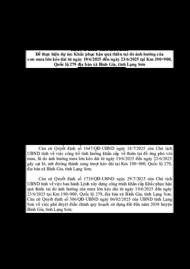 | Tiêu đề văn bản | Để thực hiện dự án: Khắc phục hậu quả thiên tai do ảnh hưởng của cơn mưa lớn kéo dài từ ngày 19/6/2025 đến ngày 23/6/2025 tại Km 190+900, Quốc lộ 279 địa bàn xã Bình Gia, tỉnh Lạng Sơn | ||