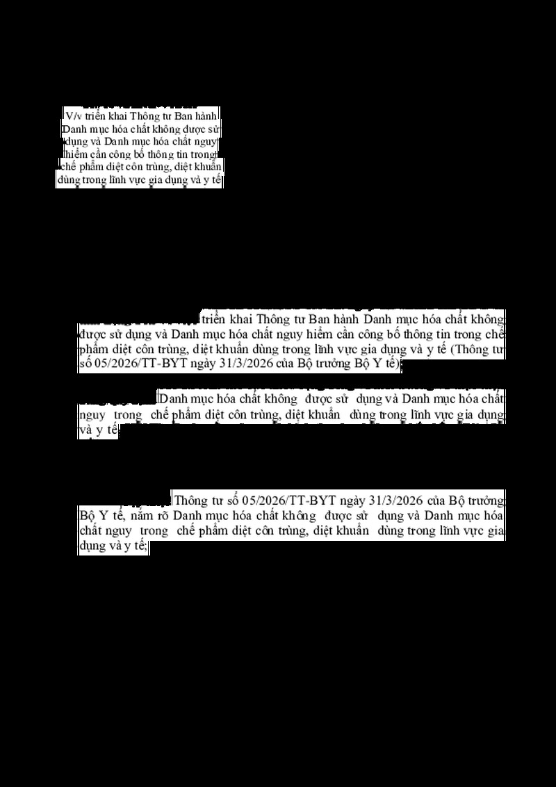 | Tiêu đề văn bản | V/v triển khai Thông tư Ban hành Danh mục hóa chất không được sử dụng và Danh mục hóa chất nguy hiểm cần công bố thông tin trong chế phẩm diệt côn trùng, diệt khuẩn dùng trong lĩnh vực gia dụng và y tế | ||