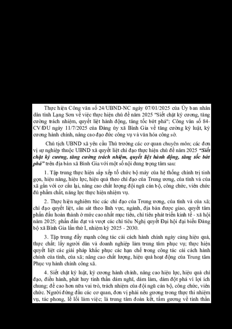 | Tiêu đề văn bản | Về việc thực hiện chủ đề "Siết chặt kỷ cương, tăng cường trách nhiệm, quyết liệt hành động, tăng tốc bứt phá" trên địa bàn xã Bình Gia | ||