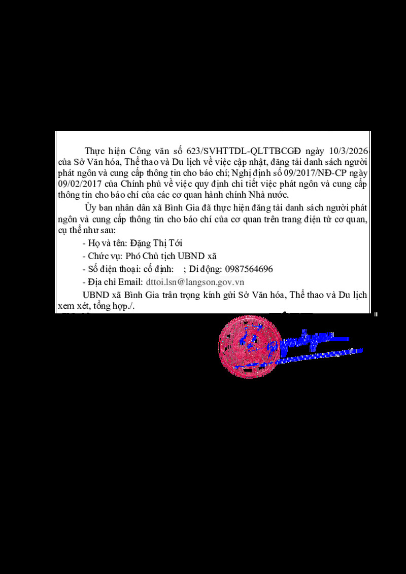 | Tiêu đề văn bản | Cung cấp danh sách người phát ngôn và cung cấp thông tin cho báo chí xã Bình Gia | ||